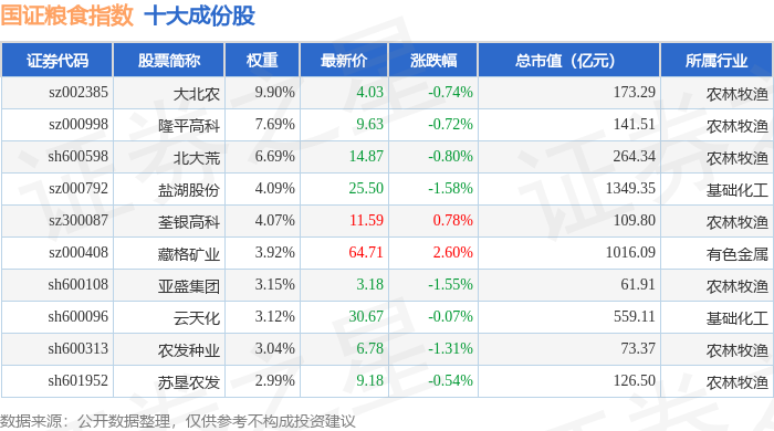 近10日内国证粮食(399365)指数成份股做了调整,新纳入了5只股票。