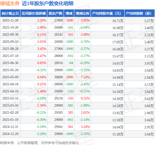 证券之星消息,近日绿城水务披露,截至2025年11月28日公司股东户数为2.7万户,较10月20日增加1000.0户,增幅为3.85%。户均持股数量由上期的3.4万股减少至3.27万股,户均持股市值为16.71万元。
