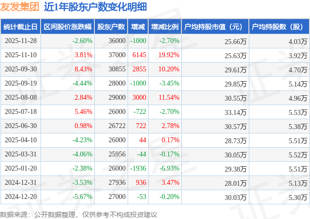 从股价来看,2025年11月10日至2025年11月28日,友发集团区间跌幅为2.6%,在此期间股东户数减少1000.0户,减幅为2.7%。