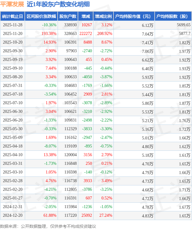 从股价来看,2025年11月20日至2025年11月28日,平潭发展区间跌幅为10.36%,在此期间股东户数增加1.03万户,增幅为3.12%。