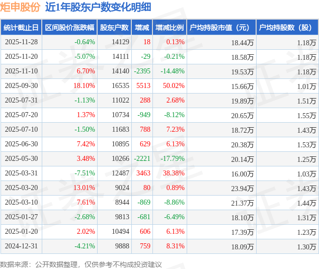 从股价来看,2025年11月20日至2025年11月28日,炬申股份区间跌幅为0.64%,在此期间股东户数增加18.0户,增幅为0.13%。