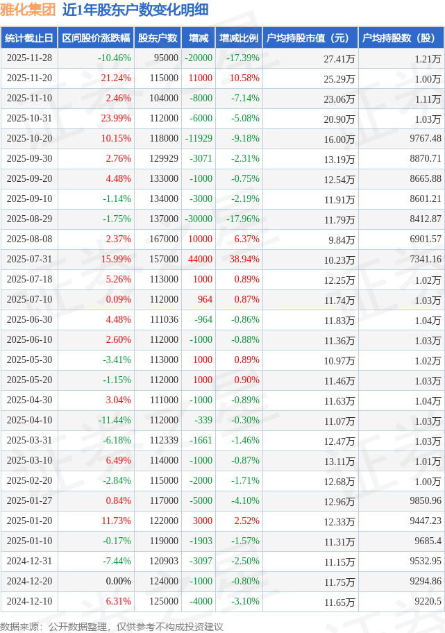 从股价来看,2025年11月20日至2025年11月28日,雅化集团区间跌幅为10.46%,在此期间股东户数减少2.0万户,减幅为17.39%。