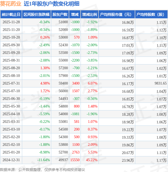 从股价来看,2025年11月20日至2025年11月28日,葵花药业区间跌幅为0.34%,在此期间股东户数减少1000.0户,减幅为1.92%。