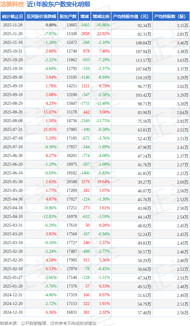 从股价来看,2025年11月20日至2025年11月28日,洁美科技区间跌幅为0.0%,在此期间股东户数减少1665.0户,减幅为10.86%。
