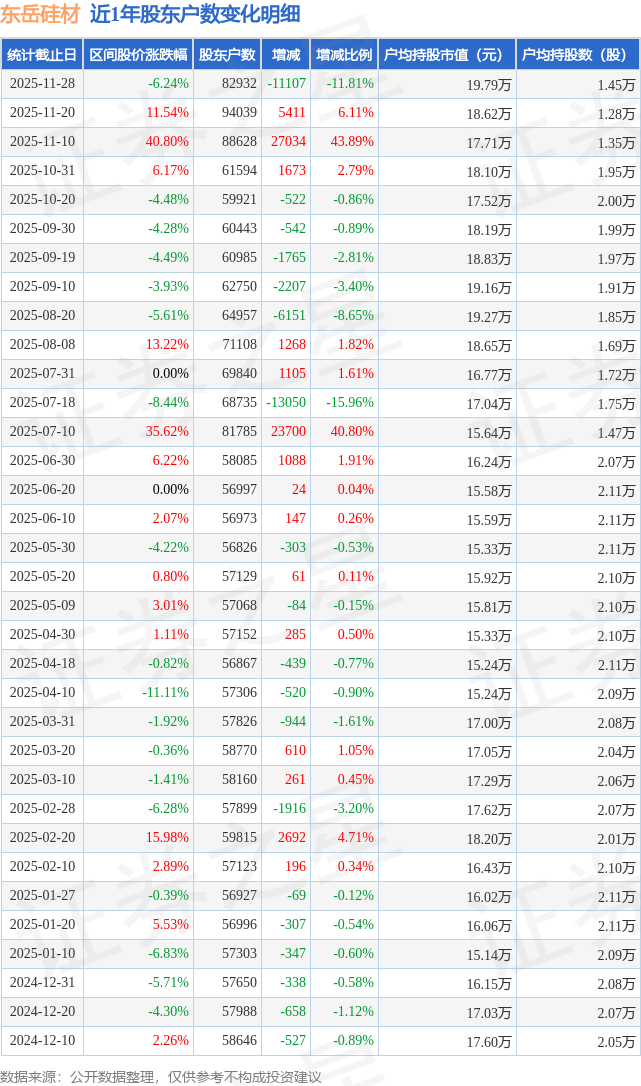 从股价来看,2025年11月20日至2025年11月28日,东岳硅材区间跌幅为6.24%,在此期间股东户数减少1.11万户,减幅为11.81%。