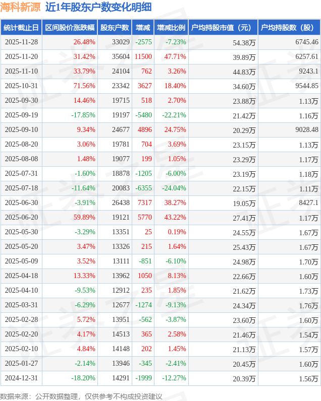 从股价来看,2025年11月20日至2025年11月28日,海科新源区间涨幅为26.48%,在此期间股东户数减少2575.0户,减幅为7.23%。