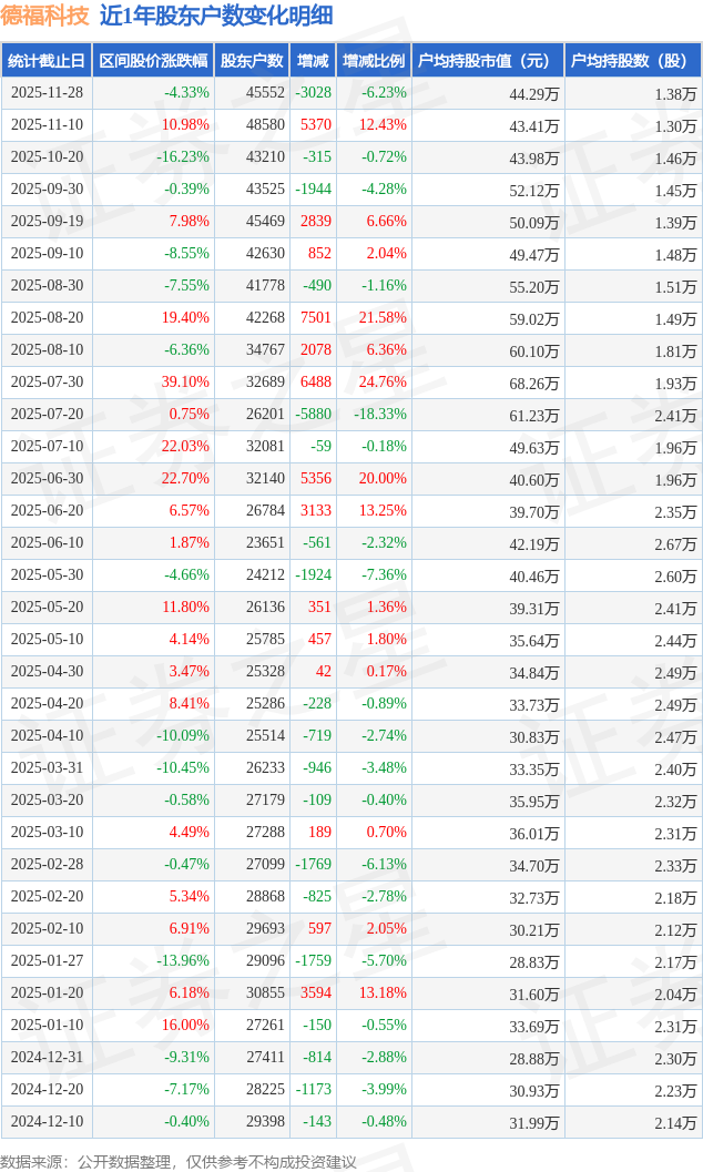 从股价来看,2025年11月10日至2025年11月28日,德福科技区间跌幅为4.33%,在此期间股东户数减少3028.0户,减幅为6.23%。