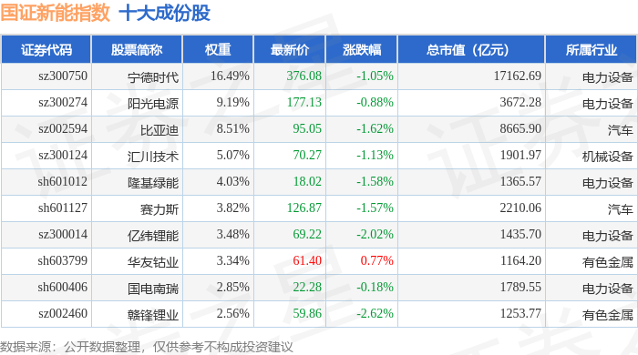 国证新能(399412)指数十大成份股详情如下: