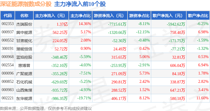 资金流向方面,深证能源(399613)指数成份股当日主力资金净流入合计5934.99万元,游资资金净流出合计7180.21万元,散户资金净流入合计1245.21万元。成份股资金流向详情见下表: