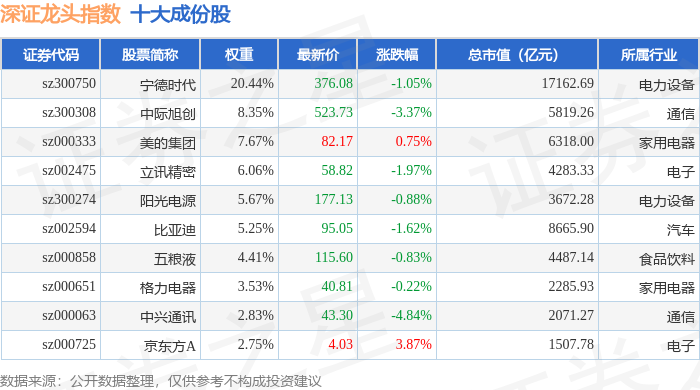 证券之星消息,12月3日,深证龙头(399653)指数报收于2998.41点,跌1.01%,成交861.18亿元,换手率1.32%。当日该指数成份股中,上涨的有12家,京东方A以3.87%的涨幅领涨,下跌的有37家,中兴通讯以4.84%的跌幅领跌。