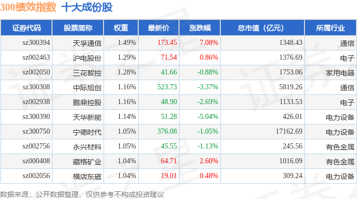 证券之星消息,12月3日,300绩效(399657)指数报收于6956.41点,跌0.3%,成交3097.54亿元,换手率1.32%。当日该指数成份股中,上涨的有89家,杰瑞股份以10.0%的涨幅领涨,下跌的有206家,中矿资源以6.53%的跌幅领跌。