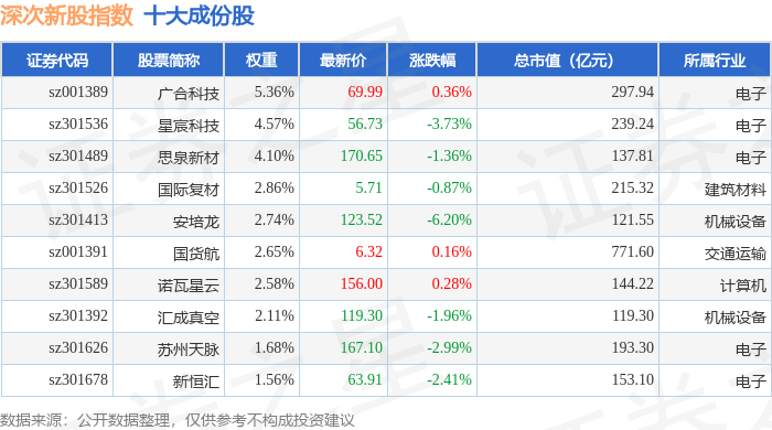 证券之星消息,12月3日,深次新股(399678)指数报收于553.08点,跌1.22%,成交101.14亿元,换手率3.29%。当日该指数成份股中,上涨的有18家,江顺科技以5.14%的涨幅领涨,下跌的有80家,安培龙以6.2%的跌幅领跌。