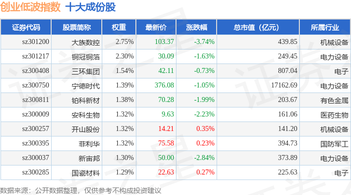 证券之星消息,12月3日,创业低波(399692)指数报收于3782.27点,跌0.4%,成交319.64亿元,换手率1.21%。当日该指数成份股中,上涨的有32家,瑞丰新材以5.79%的涨幅领涨,下跌的有67家,东岳硅材以4.1%的跌幅领跌。
