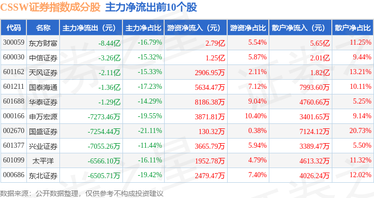 资金流向方面,CSSW证券(399707)指数成份股当日主力资金净流出合计29.81亿元,游资资金净流入合计10.63亿元,散户资金净流入合计19.18亿元。成份股资金流向详情见下表: