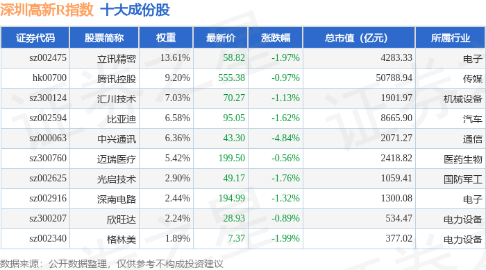 深圳高新R(480038)指数十大成份股详情如下: