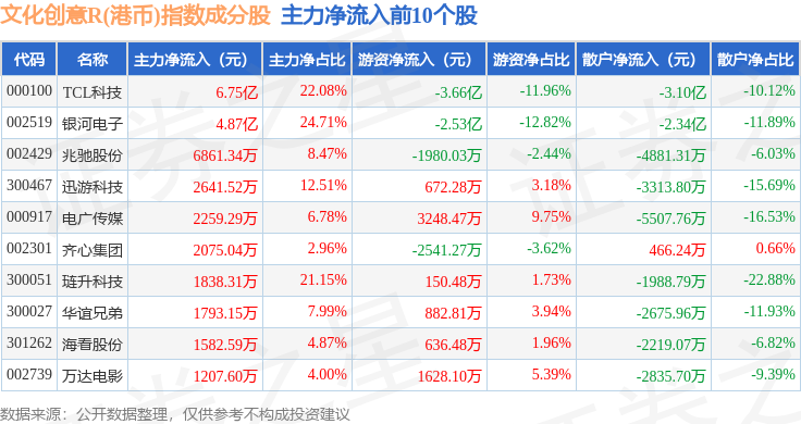 资金流向方面,文化创意R(港币)(480047)指数成份股当日主力资金净流出合计29.98亿元,游资资金净流出合计2.46亿元,散户资金净流入合计32.44亿元。成份股资金流向详情见下表: