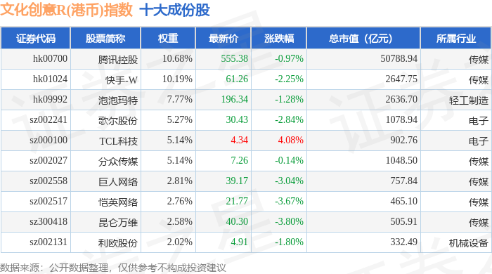 文化创意R(港币)(480047)指数十大成份股详情如下: