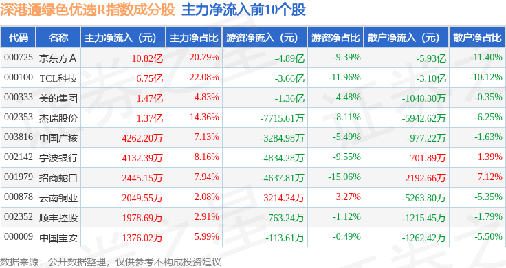 资金流向方面,深港通绿色优选R(483011)指数成份股当日主力资金净流出合计32.86亿元,游资资金净流出合计2.64亿元,散户资金净流入合计35.51亿元。成份股资金流向详情见下表: