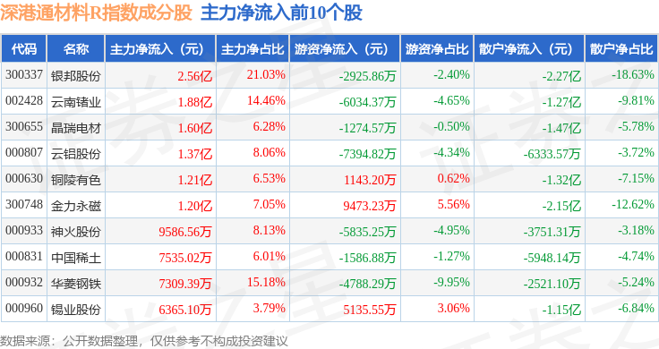资金流向方面,深港通材料R(483015)指数成份股当日主力资金净流出合计54.33亿元,游资资金净流入合计6.0亿元,散户资金净流入合计48.33亿元。成份股资金流向详情见下表: