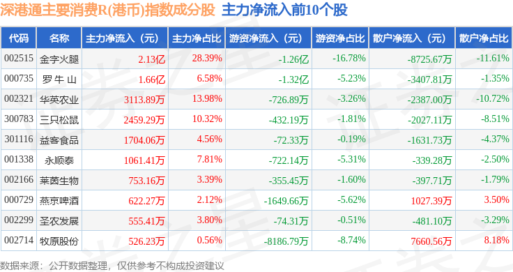 资金流向方面,深港通主要消费R(港币)(483022)指数成份股当日主力资金净流出合计8.05亿元,游资资金净流出合计3.97亿元,散户资金净流入合计12.02亿元。成份股资金流向详情见下表: