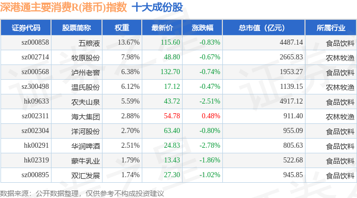 深港通主要消费R(港币)(483022)指数十大成份股详情如下: