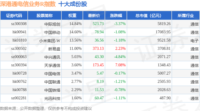 深港通电信业务R(483029)指数十大成份股详情如下: