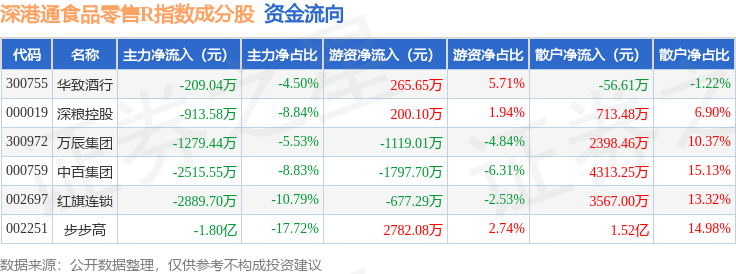 资金流向方面,深港通食品零售R(483037)指数成份股当日主力资金净流出合计2.58亿元,游资资金净流出合计346.18万元,散户资金净流入合计2.62亿元。成份股资金流向详情见下表: