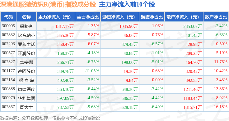 资金流向方面,深港通服装纺织R(港币)(483042)指数成份股当日主力资金净流出合计2.21亿元,游资资金净流入合计1124.42万元,散户资金净流入合计2.09亿元。成份股资金流向详情见下表: