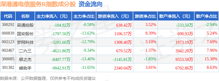 资金流向方面,深港通电信服务R(483057)指数成份股当日主力资金净流出合计2.73亿元,游资资金净流入合计4927.15万元,散户资金净流入合计2.23亿元。成份股资金流向详情见下表:
