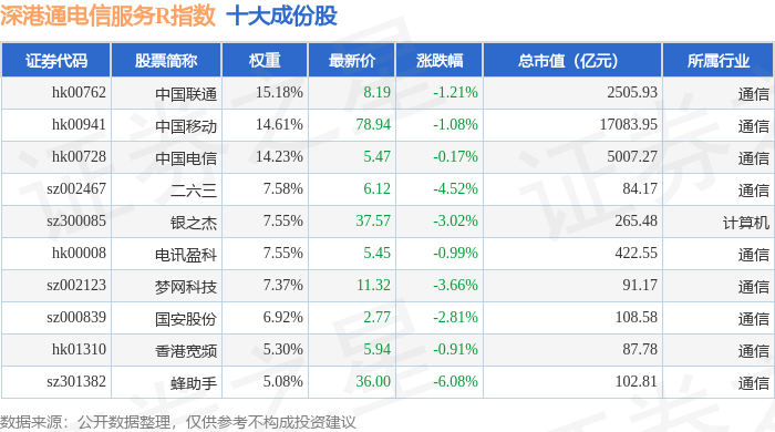 深港通电信服务R(483057)指数十大成份股详情如下:
