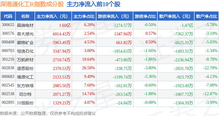 资金流向方面,深港通化工R(483063)指数成份股当日主力资金净流出合计21.0亿元,游资资金净流入合计3.41亿元,散户资金净流入合计17.58亿元。成份股资金流向详情见下表: