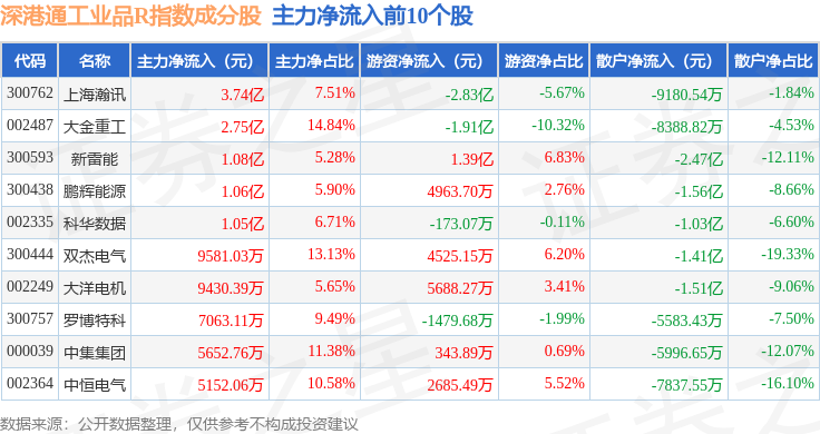 资金流向方面,深港通工业品R(483069)指数成份股当日主力资金净流出合计74.37亿元,游资资金净流入合计11.57亿元,散户资金净流入合计62.79亿元。成份股资金流向详情见下表: