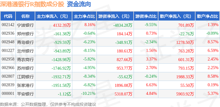 资金流向方面,深港通银行R(483081)指数成份股当日主力资金净流出合计1.62亿元,游资资金净流入合计4121.52万元,散户资金净流入合计1.21亿元。成份股资金流向详情见下表: