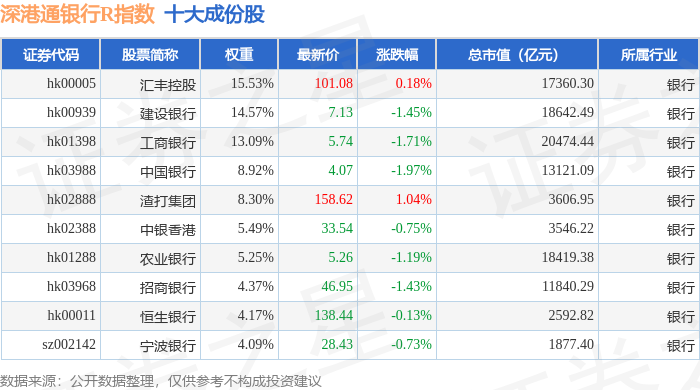 证券之星消息,12月3日,深港通银行R(483081)指数报收于12472.18点,跌0.75%,成交85.04亿元,换手率0.19%。当日该指数成份股中,上涨的有7家,渣打集团以1.04%的涨幅领涨,下跌的有21家,中国光大银行以2.15%的跌幅领跌。
