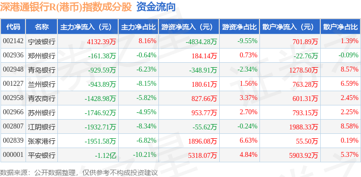 资金流向方面,深港通银行R(港币)(483082)指数成份股当日主力资金净流出合计1.62亿元,游资资金净流入合计4121.52万元,散户资金净流入合计1.21亿元。成份股资金流向详情见下表: