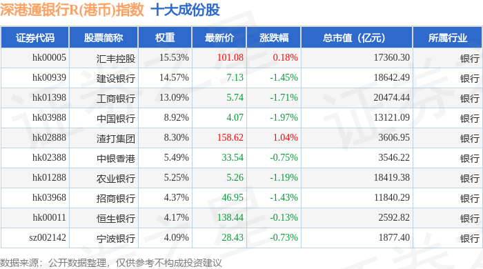 深港通银行R(港币)(483082)指数十大成份股详情如下: