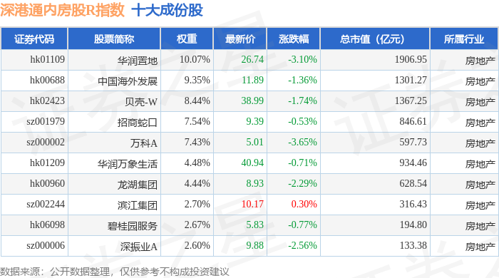 深港通内房股R(483083)指数十大成份股详情如下:
