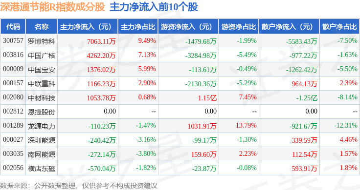 资金流向方面,深港通节能R(483085)指数成份股当日主力资金净流出合计39.7亿元,游资资金净流入合计5.32亿元,散户资金净流入合计34.38亿元。成份股资金流向详情见下表: