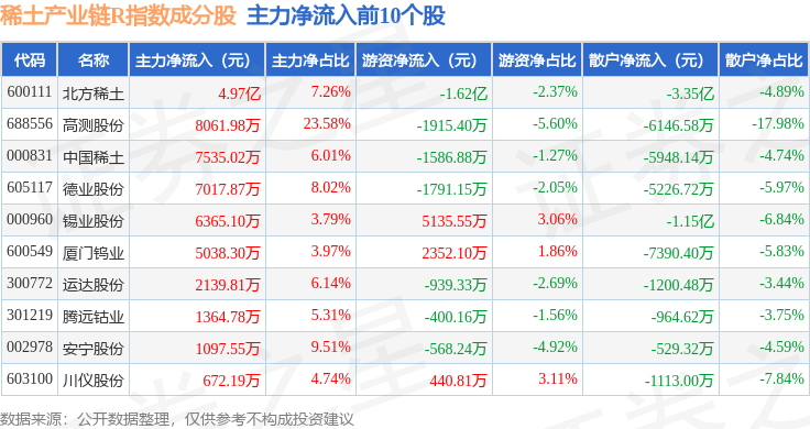 资金流向方面,稀土产业链R(489013)指数成份股当日主力资金净流出合计18.99亿元,游资资金净流入合计3.26亿元,散户资金净流入合计15.73亿元。成份股资金流向详情见下表:
