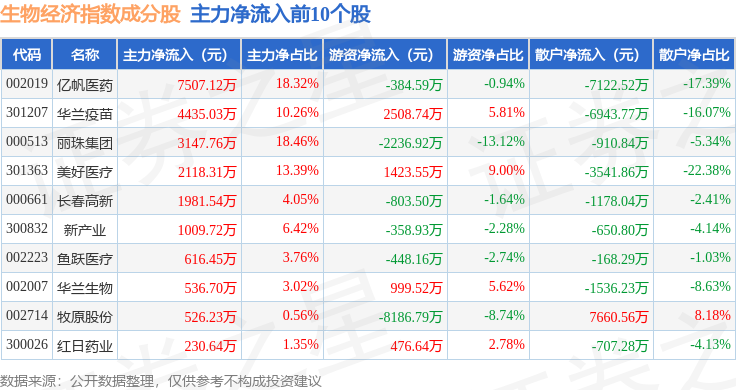 资金流向方面,生物经济(970038)指数成份股当日主力资金净流出合计3.59亿元,游资资金净流入合计1.18亿元,散户资金净流入合计2.41亿元。成份股资金流向详情见下表: