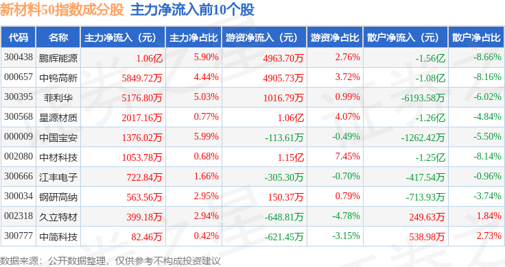 资金流向方面,新材料50(970042)指数成份股当日主力资金净流出合计34.81亿元,游资资金净流入合计6.38亿元,散户资金净流入合计28.43亿元。成份股资金流向详情见下表: