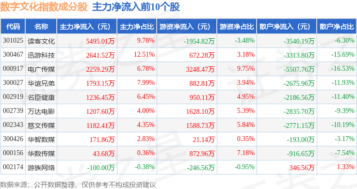 资金流向方面,数字文化(970047)指数成份股当日主力资金净流出合计21.53亿元,游资资金净流入合计2.63亿元,散户资金净流入合计18.9亿元。成份股资金流向详情见下表: