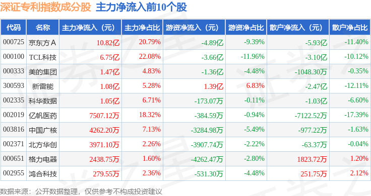 资金流向方面,深证专利(970067)指数成份股当日主力资金净流出合计33.4亿元,游资资金净流入合计1.68亿元,散户资金净流入合计31.72亿元。成份股资金流向详情见下表: