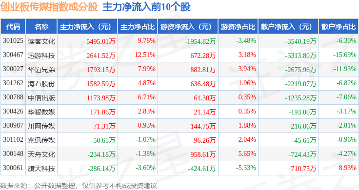 资金流向方面,创业板传媒(970084)指数成份股当日主力资金净流出合计23.02亿元,游资资金净流入合计2.61亿元,散户资金净流入合计20.41亿元。成份股资金流向详情见下表:
