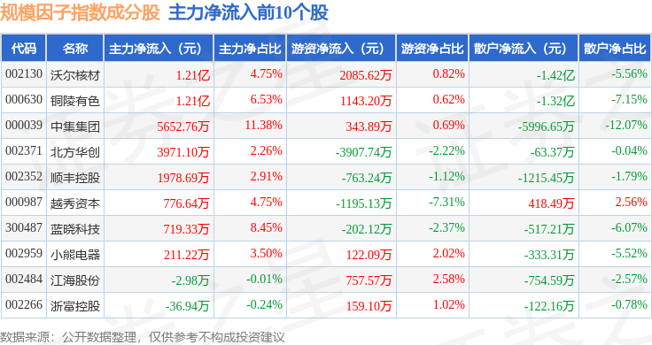 资金流向方面,规模因子(980055)指数成份股当日主力资金净流出合计38.99亿元,游资资金净流入合计10.4亿元,散户资金净流入合计28.6亿元。成份股资金流向详情见下表: