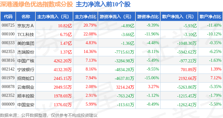 资金流向方面,深港通绿色优选(983011)指数成份股当日主力资金净流出合计32.86亿元,游资资金净流出合计2.64亿元,散户资金净流入合计35.51亿元。成份股资金流向详情见下表: