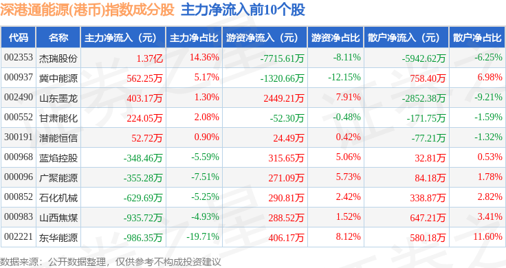 资金流向方面,深港通能源(港币)(983014)指数成份股当日主力资金净流入合计6690.26万元,游资资金净流出合计4477.05万元,散户资金净流出合计2213.2万元。成份股资金流向详情见下表: