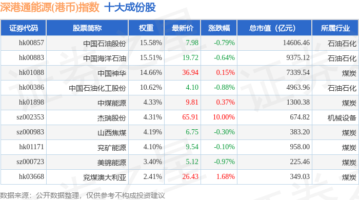 深港通能源(港币)(983014)指数十大成份股详情如下:
