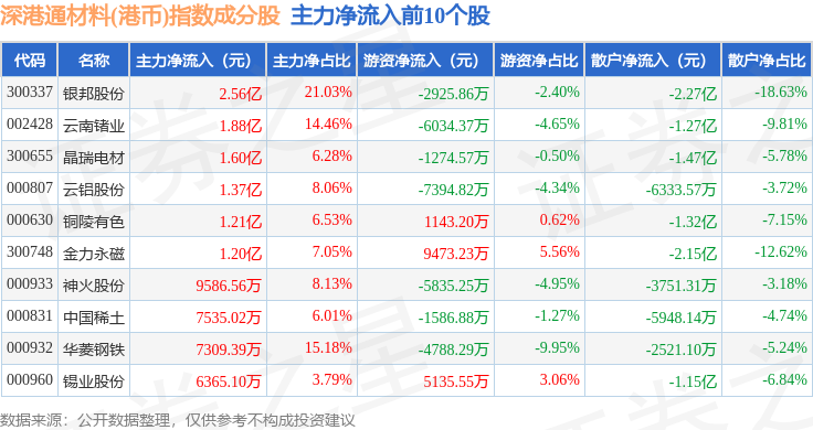 资金流向方面,深港通材料(港币)(983016)指数成份股当日主力资金净流出合计54.33亿元,游资资金净流入合计6.0亿元,散户资金净流入合计48.33亿元。成份股资金流向详情见下表: