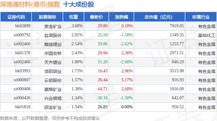 深港通材料(港币)(983016)指数十大成份股详情如下: